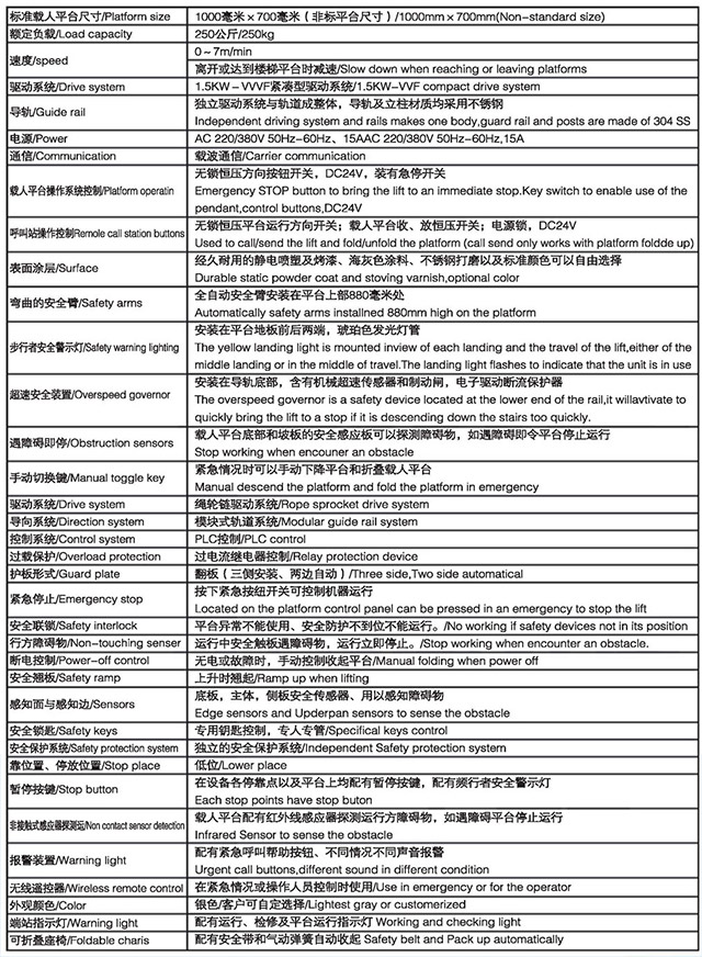 斜掛式無障礙升降平合按其運行方向分曲線型和直線型二種。直線型多采用齒輪齒條式驅動機構,沿樓梯做上升和下降,只能作直線運行不能轉彎,傾斜角一般不大于35度
